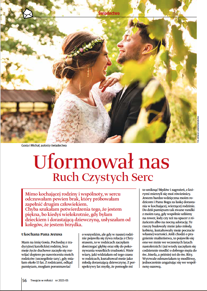 - „Uformował nas Ruch Czystych Serc” – Czasem drobny gest, świadczący o zainteresowaniu drugą osobą, może mieć duże znaczenie. Przekonują o tym Gosia i Michał, którzy poznali się na rekolekcjach, a dziś już są małżeństwem.